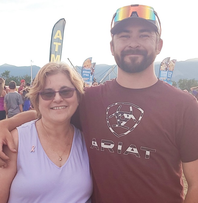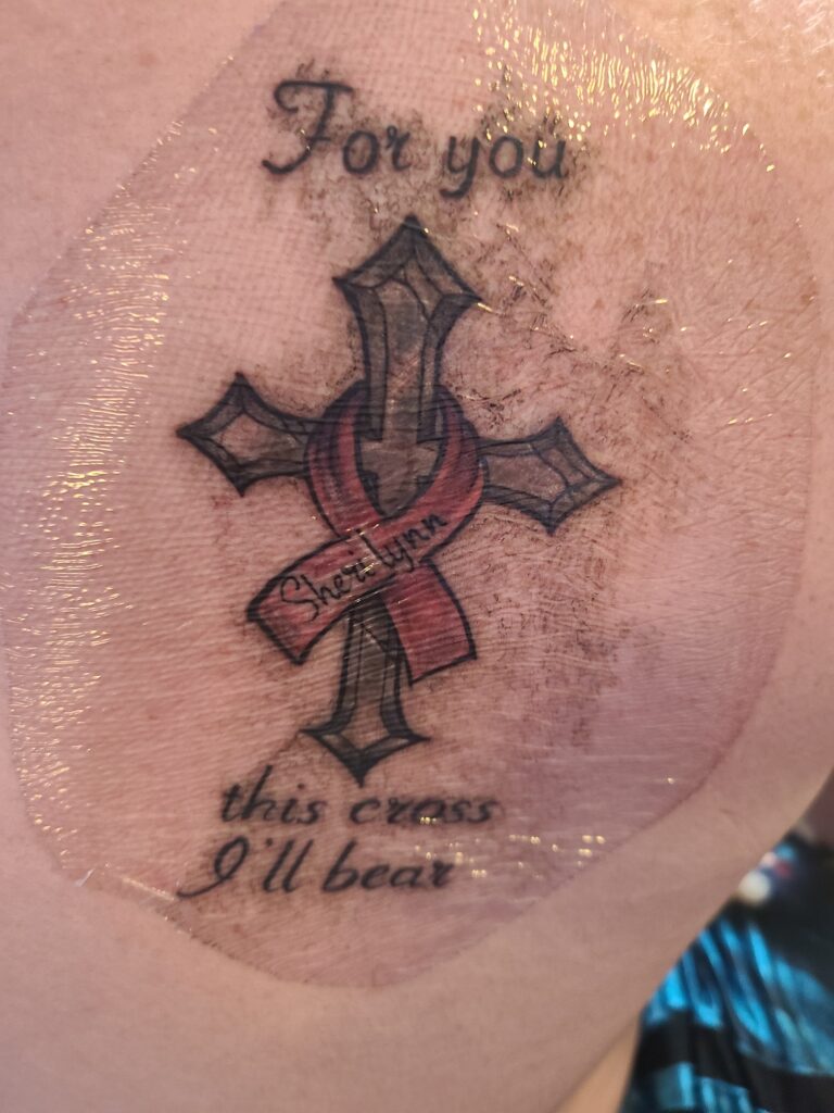 My son Ryan decided to surprise me with a visit form Kansas this past weekend. He showed up on the front porch Saturday morning. He said he had an appointment in Denver to get to so we chatted for a while and he headed out, letting me know he’d have all day Sunday to hang out with us. We had grocery shopping to do and other errands on Saturday anyways. Sunday morning he met us at church, then we went to Texas Roadhouse for lunch. We hung out at the house for a while (everyone napped) and then went to the Labor Day Lift Off Balloon Glow that night. Before we headed out, he showed me what his appointment in Denver had been for. He had gotten his first tattoo in honor of me!! I was so touched!!