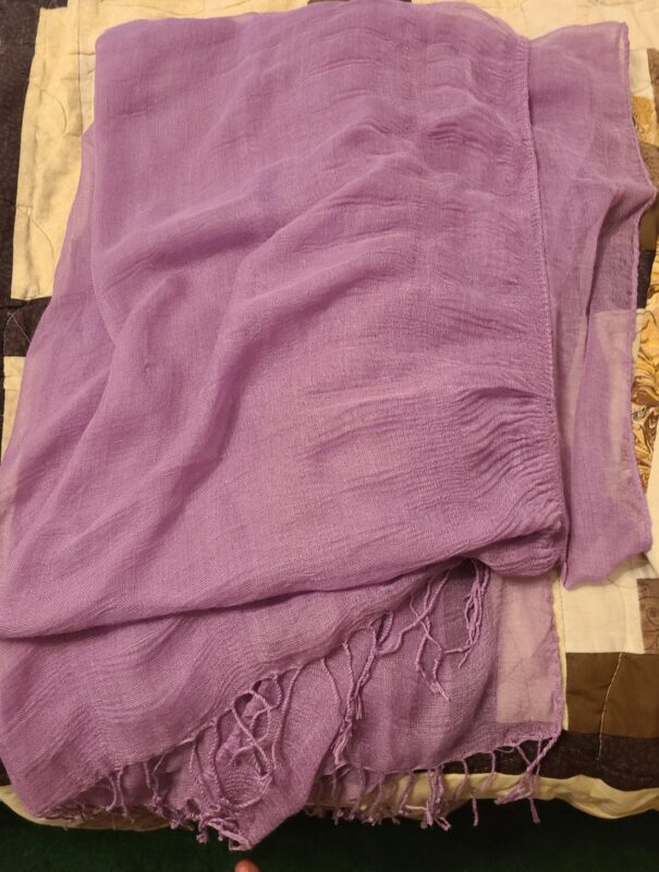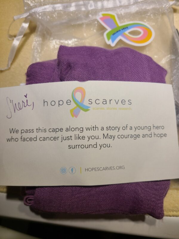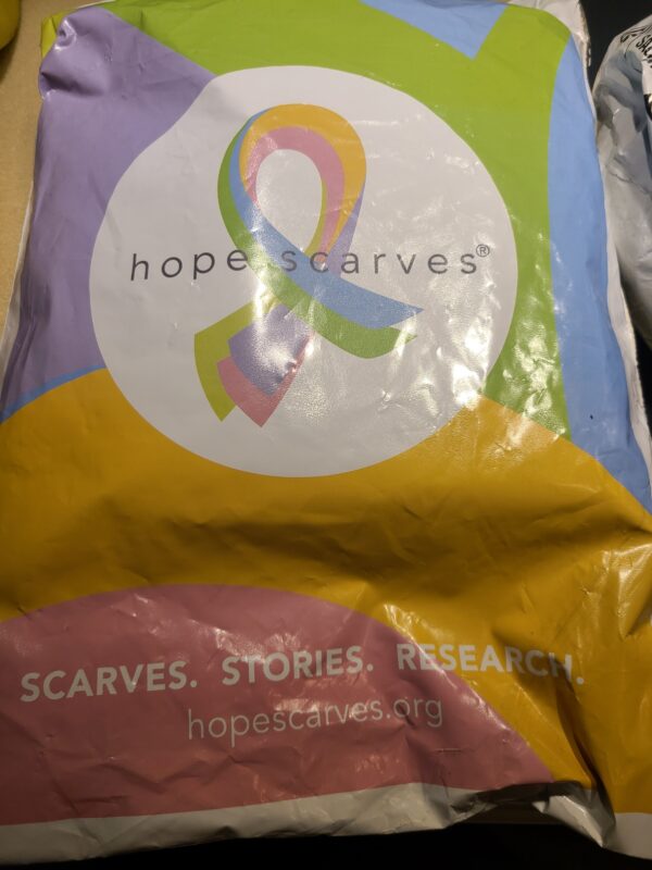 In good news, I got this lovely scarf from a charity that uses the scarfs to share women’s stories of their cancer journeys. You use the scarf until you’re done, then send it back along with your story and the charity cleans it and sends it to another person. Here are a few pictures ~