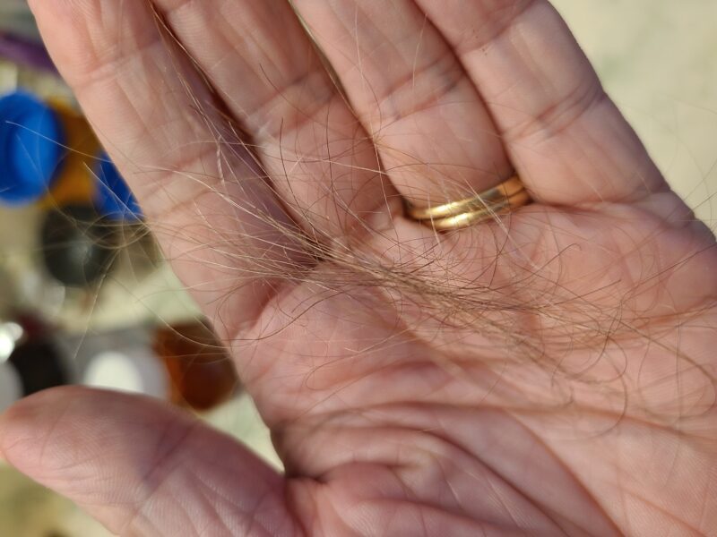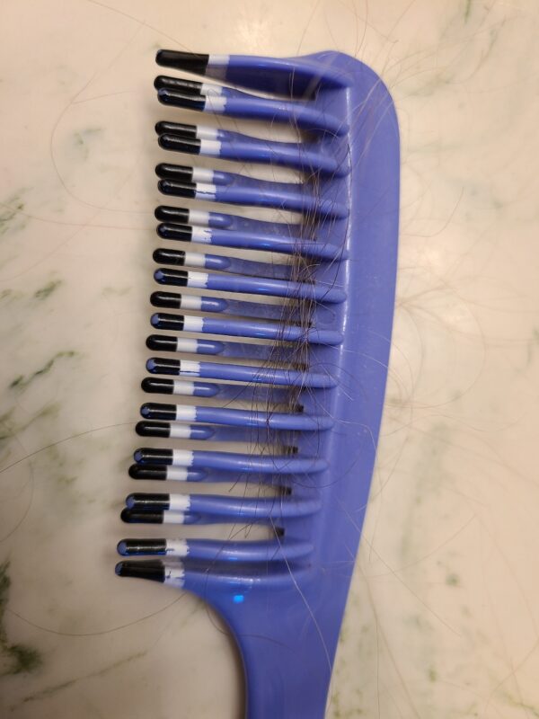 Well the day has arrived. This morning when I got out of the shower, my hair was uncharacteristically tangled. When I finally got the first tangle out, it came with a large clump of hair. Everything I read about hair loss said that it would happen about 2-3 weeks after the first chemo. For me it has hit exactly 14 days after my first chemo. Not sure how well you can see in this picture, but I combed my hair later in the day today and as you can see, the hair is still falling out at an alarming rate.