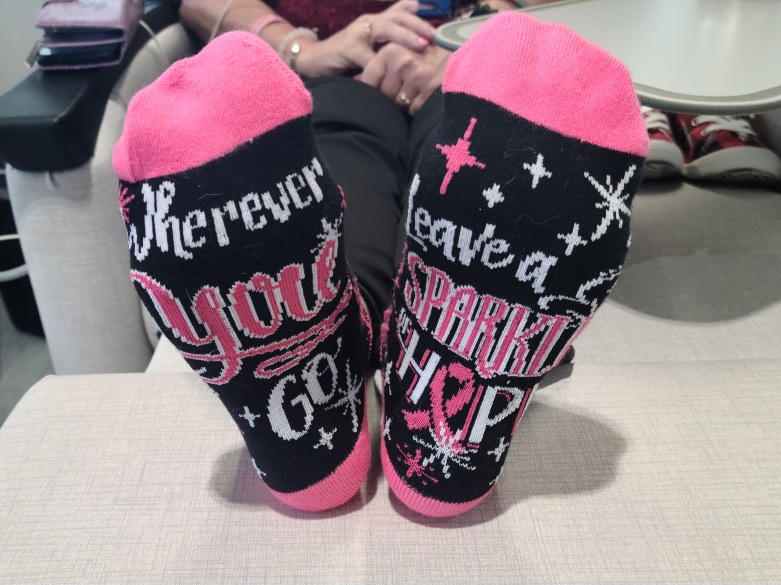 We finally got the flushing back down to a more normal level for me and began the chemo. Shortly after starting I got nauseous. So they gave me some Pepcid IV and ginger ale and crackers. As soon as that resolved we continued with the chemo. I was of course, wearing fun socks again: